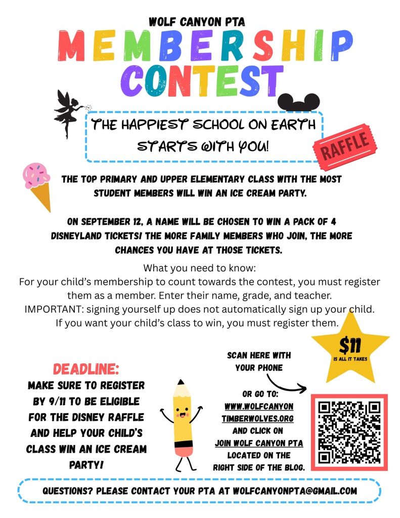 Calling all TIMBERWOLVES! Do you love your school and want to make it the best year yet? Don’t sleep on this!! We want everyone to be able to enjoy the fun that PTA brings all year long. If you haven’t already, make sure you and your family JOIN PTA TODAY! You’ll get to enjoy the member-only perks at all of our upcoming events and claim your spot in this magical contest!